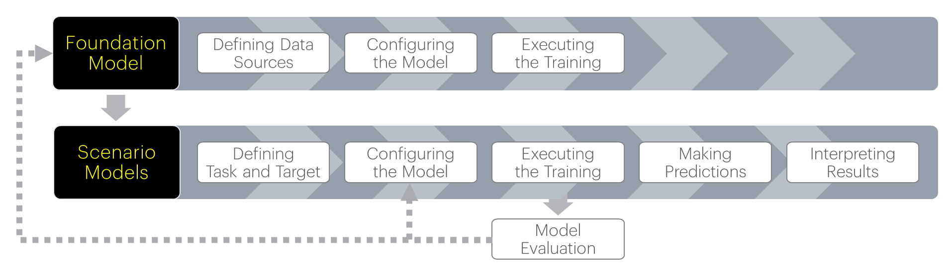 Define a task and target, then fine-tune a scenario model on top of the foundation model. Evaluate, iterate, and then run predictions and interpret results. You can use checkpoints to resume training or to branch into new scenario models later.